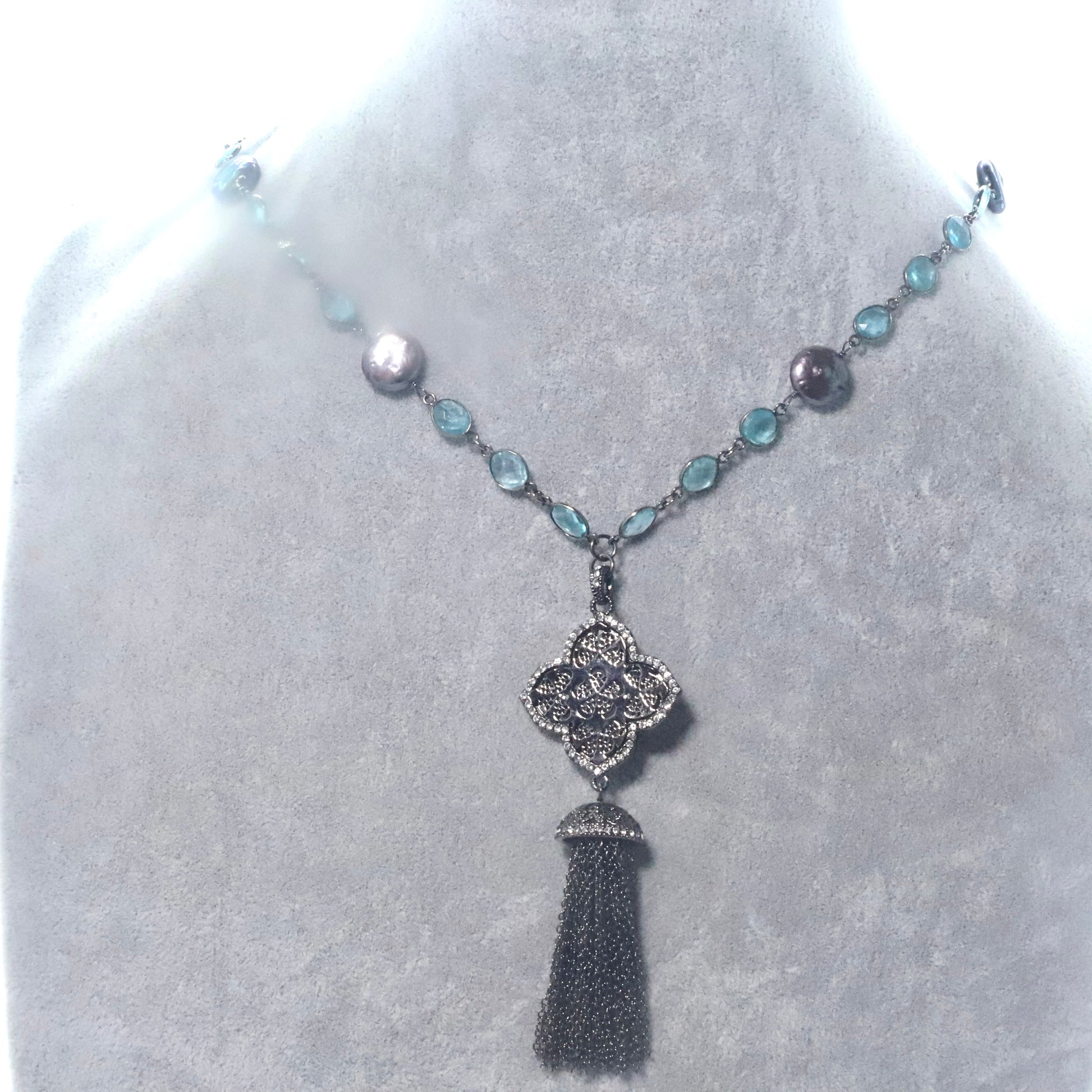 Make a statement in this dazzling deep aqua apatite and freshwater pearl necklace with a crystal and chain tassel.