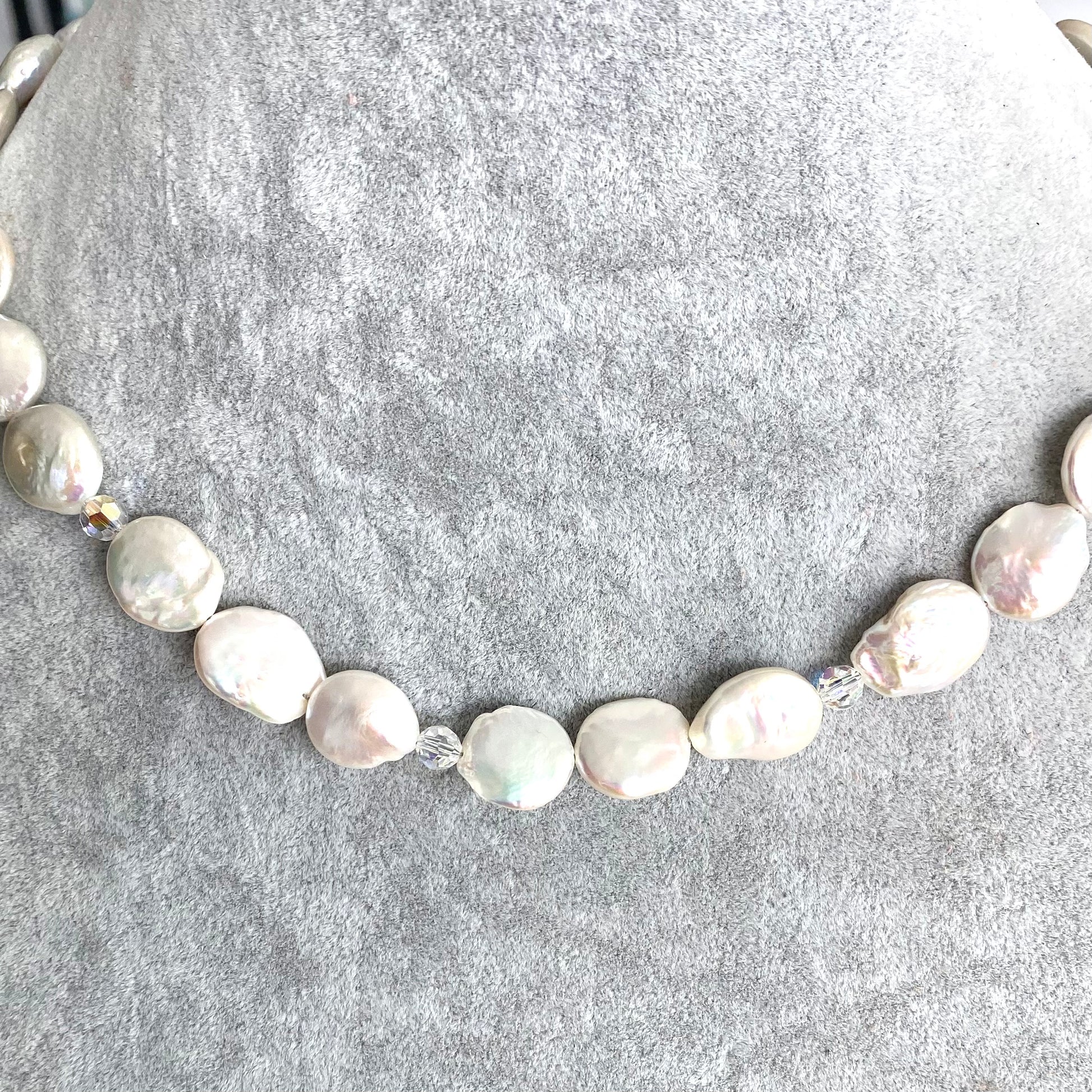 Indulge in the ultimate luxury with our Coin Pearl and Crystal Necklace. Made with luminous freshwater coin pearls and enhanced by sparkling crystal accents, this necklace will elevate any outfit. Perfect for any occasion, from casual to glamorous, let these pearls take you everywhere and anywhere.