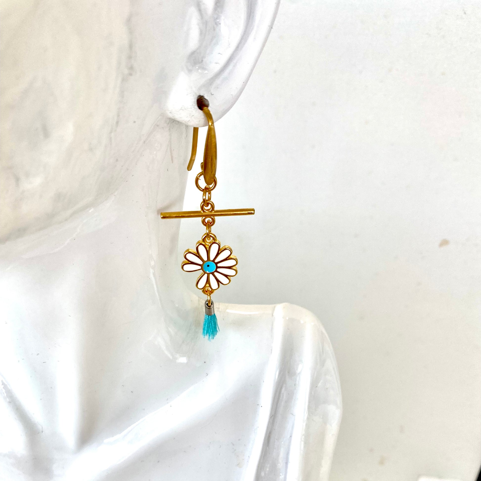 Look no further! This happy daisy in white and gold, with turquoise accent and tassel will go with all things summer! Treat yourself to these beauties.