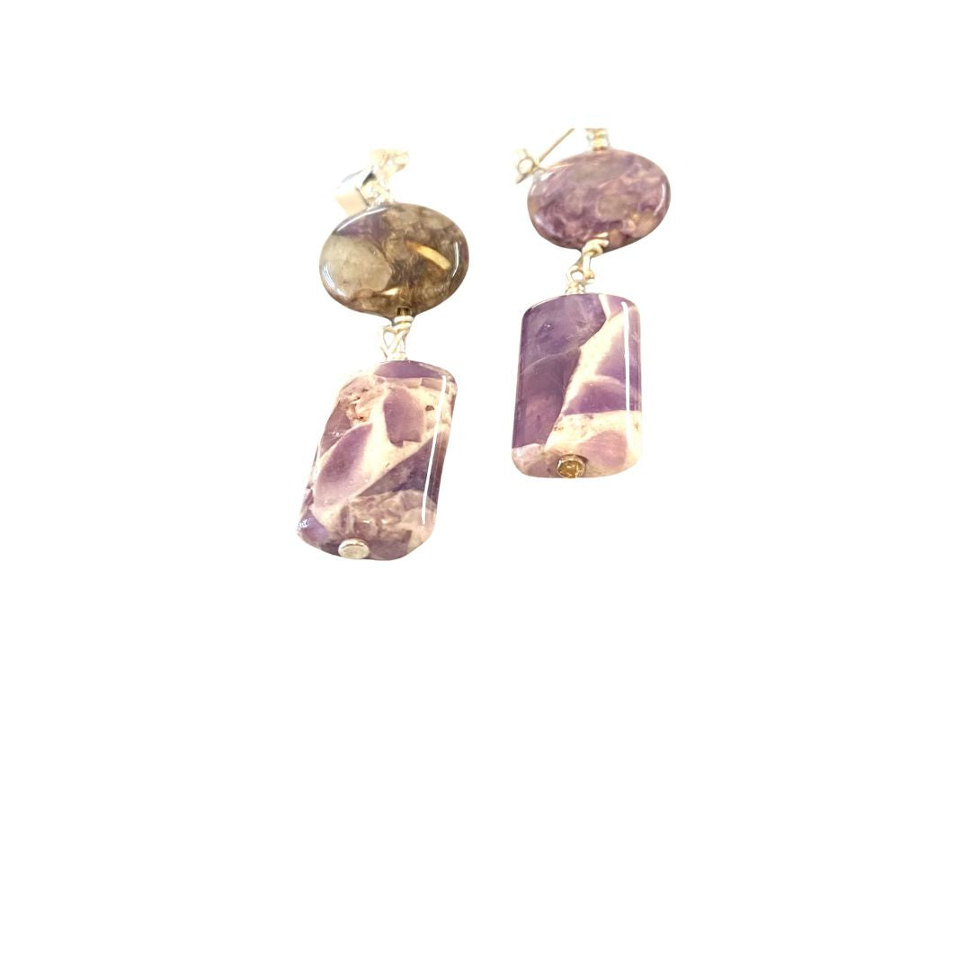 Elevate any outfit with our Dogtooth Amethyst Earrings, featuring natural dogtooth amethyst stones in a neutral palette. These versatile earrings can be worn on their own or paired with our matching necklace N0854 for a complete look. Add a touch of elegance and natural beauty to your jewelry collection.