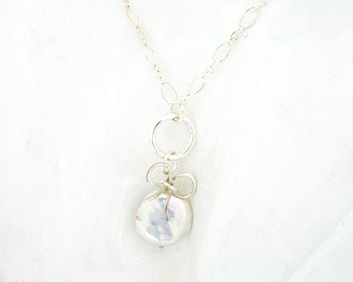 Looking for something simple but elegant? This freshwater coin pearl pendant fits the bill. It is on a 16 sterling silver chain with a sterling silver bow accent for additional femininity. It has a front closure.