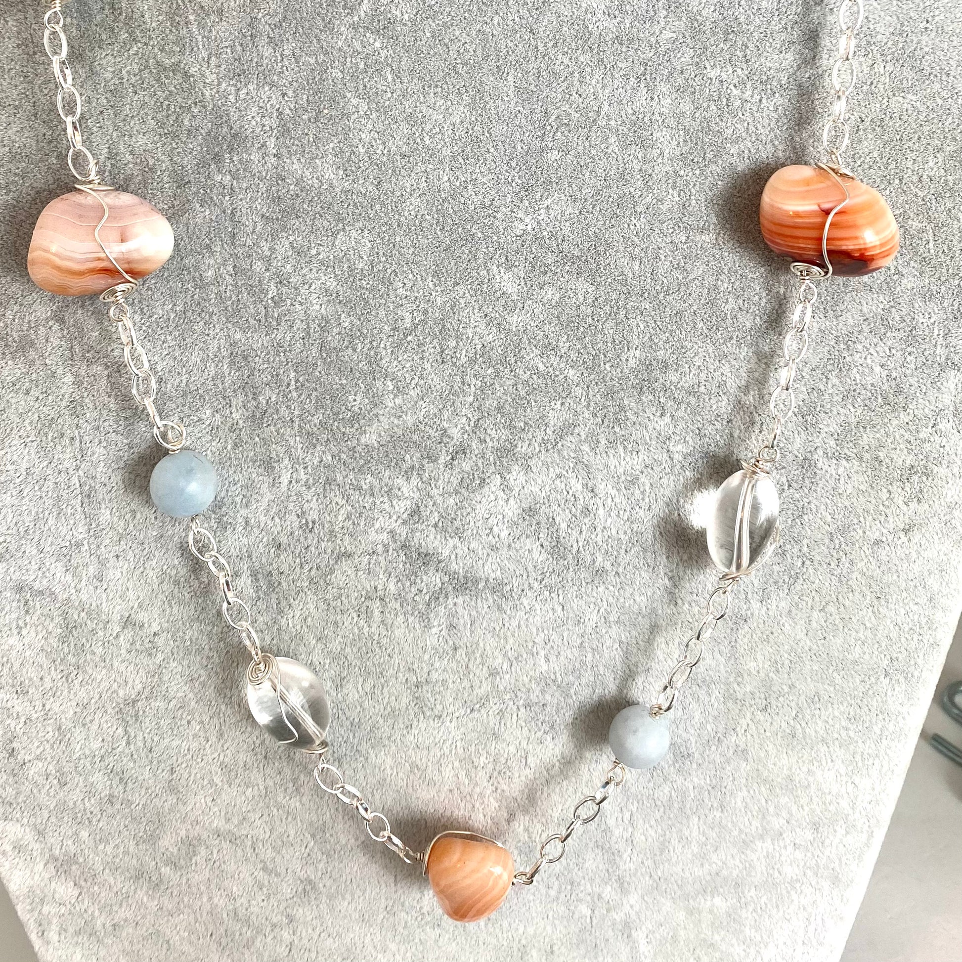 Inspired by the land of Fire and Ice, this carnelian, crystal quartz and aquamarine necklace will go with everything. The colours will enhance all skin tones.