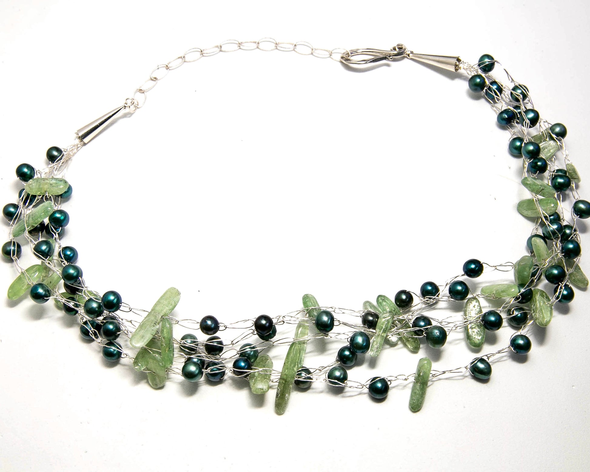 Green Kyanite and Fresh Water Pearl Multi-Strand Necklace