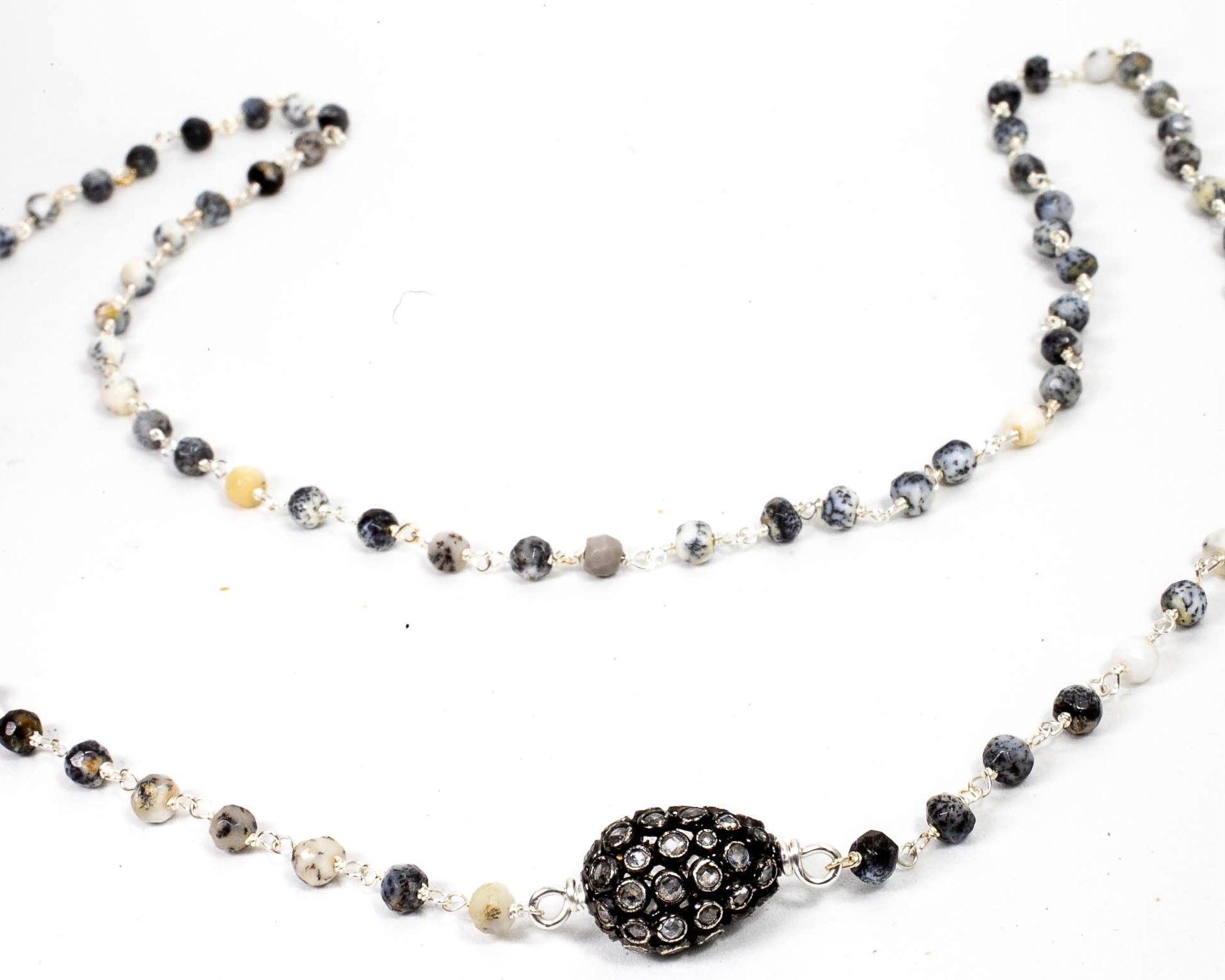 The beautiful shades of Jasper in this long necklace are accented by the white sapphire bead that can be worn in the centre or on the side. This classic combination will be a necklace you enjoy for years to come. The jasper stones are 4 mm and the sapphire bead is 10 mm making this 26 inch necklace delicate yet present.