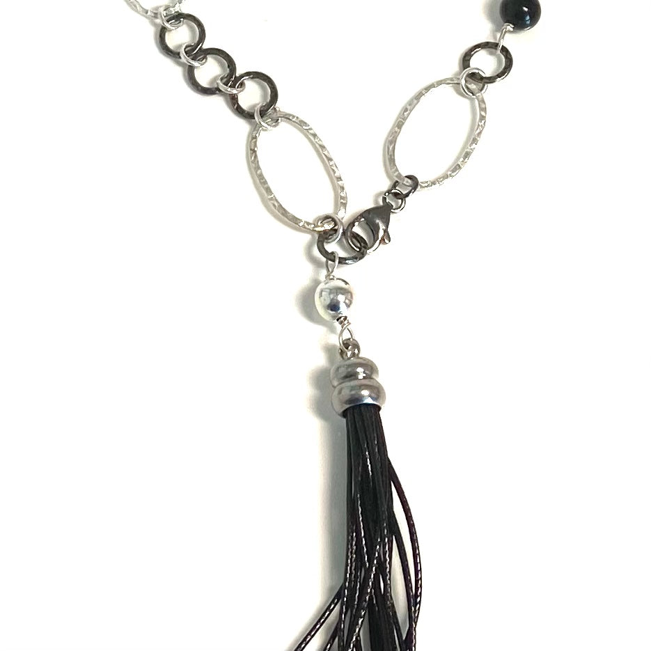 Classic combo of black and silver, modern design with the addition of the leather tassel, this is truly an all around necklace.