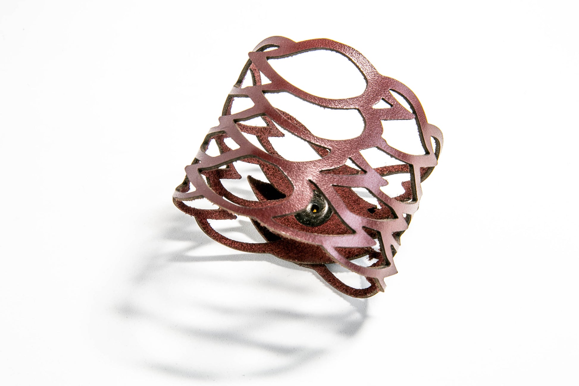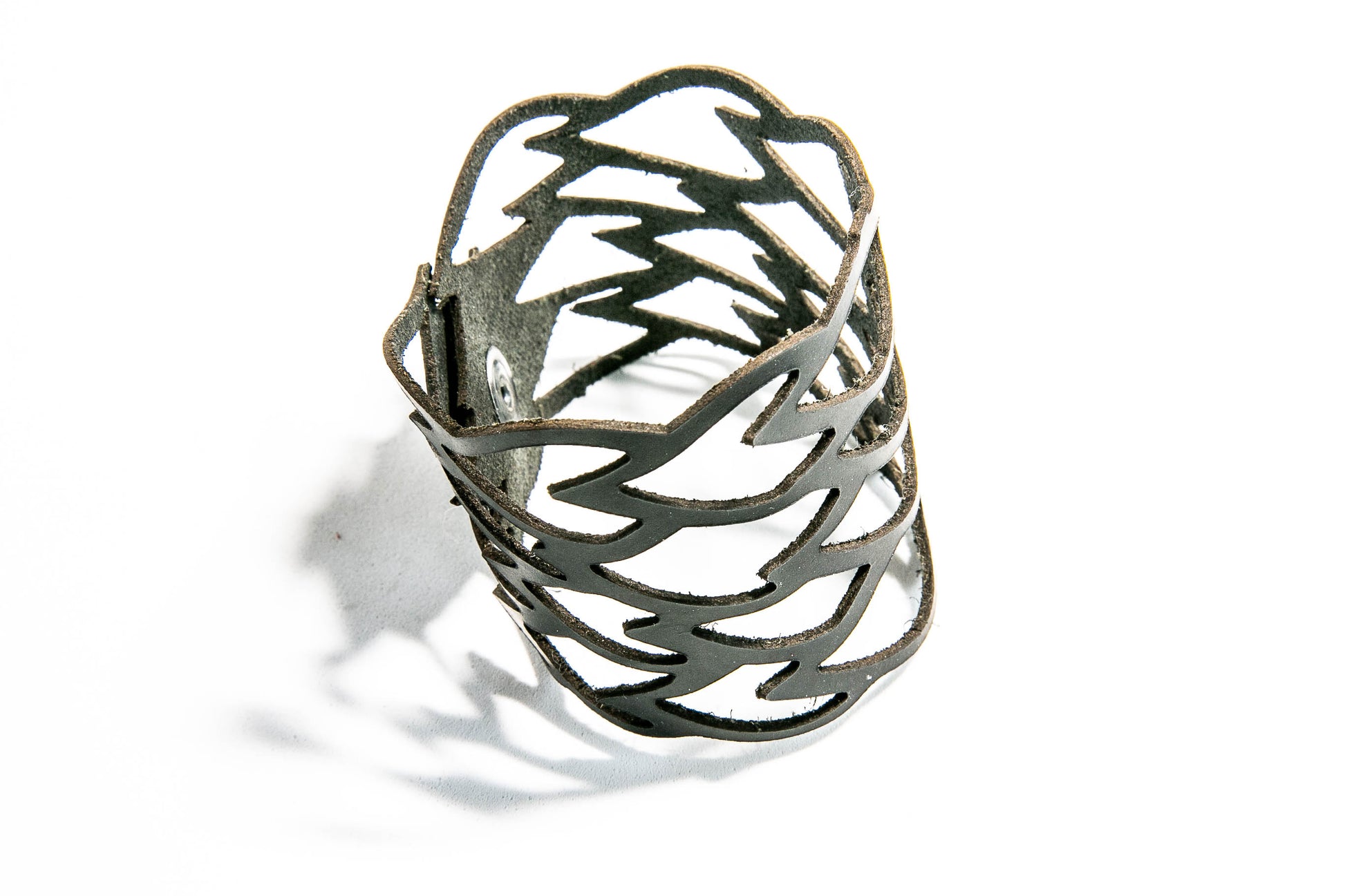 This super comfortable two inch wide leather cuff is a conversation starter. Is it flames? Fish Scales? Leaves? Dragon Scales? You decide, and survey your friends when you wear this delightful bracelet.