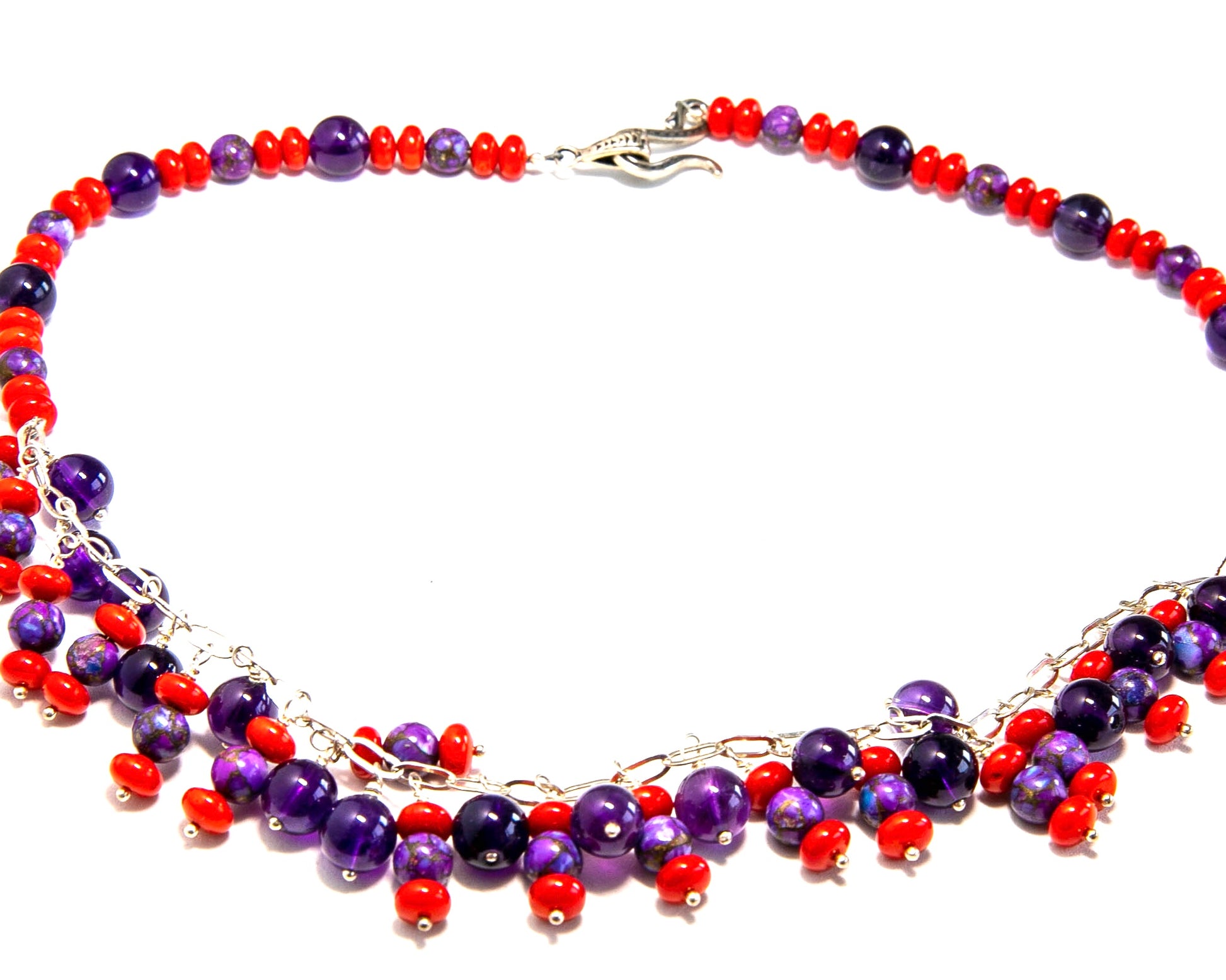 This red Bamboo Coral, Amethyst and Purple Turquoise necklace is playful and will bring a smile to your face everytime you wear it. It will look great with all your neutral colours and imagine when you participate in your virtual events, how great it will look. Pair with matching earrings (sold separately) for a complete look.