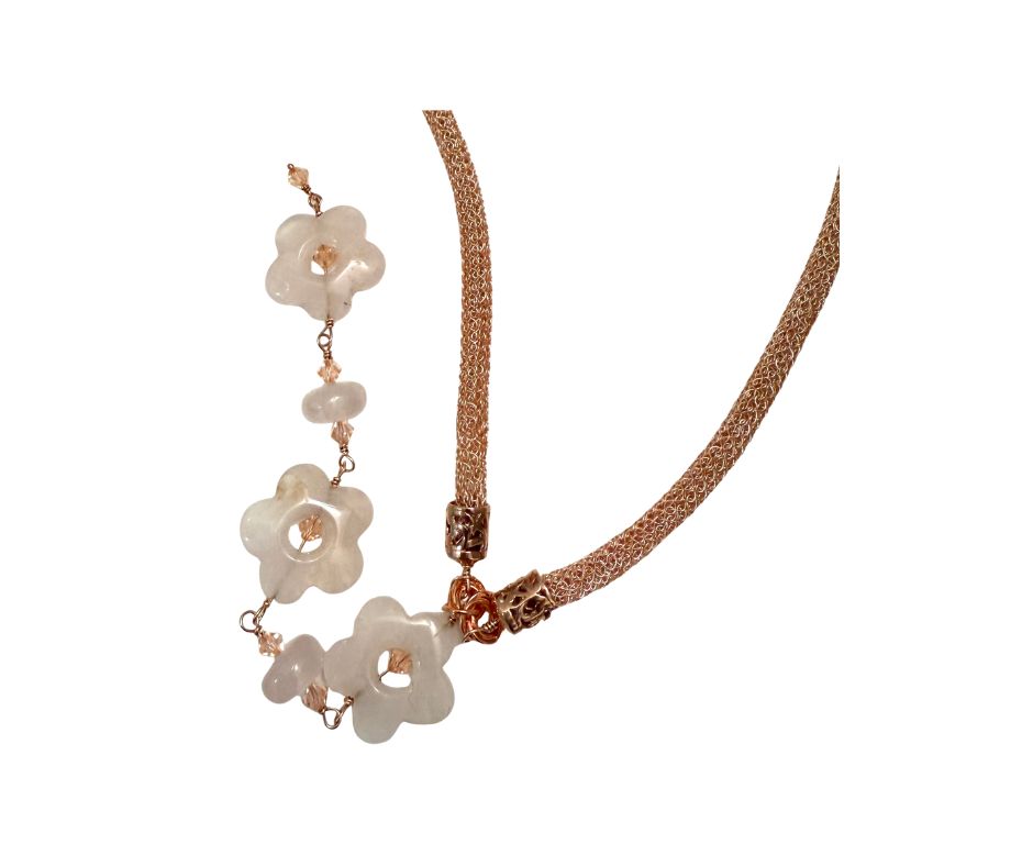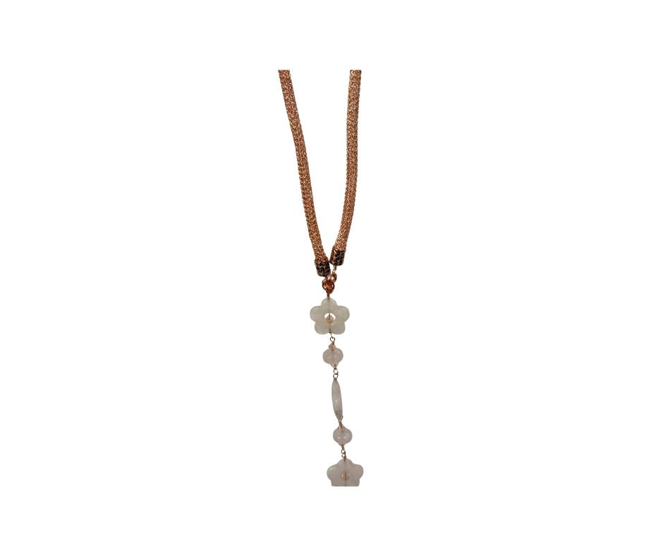 This rose gold chain blossoms with carved rose quartz flowers. Softly statement-making, it's as sweet as a summer evening. The opera length necklace is the perfect accessory for someone as unique as you.