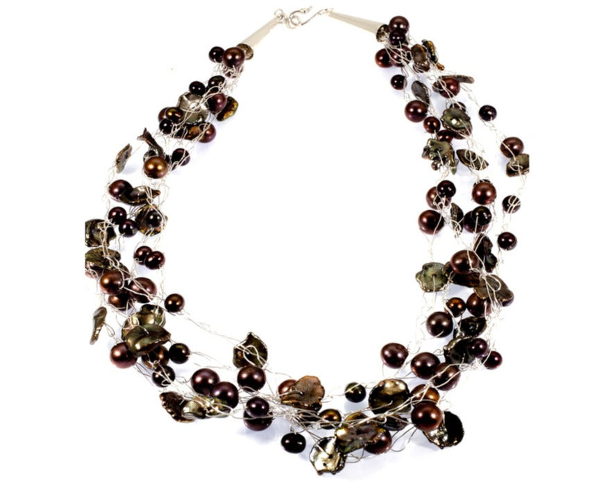 As you move into fall, this necklace will be the one you grab every day. The rich tones of the freshwater pearls give a little magenta, a little green and a rich brown.