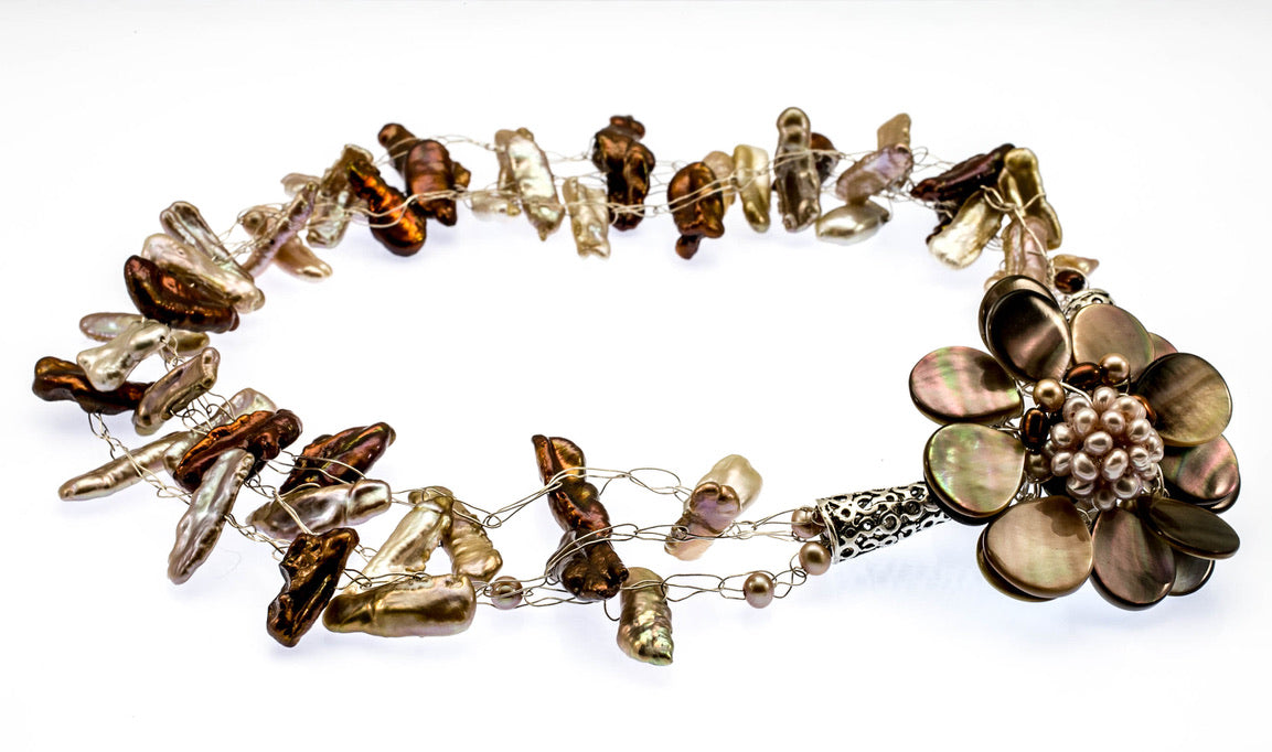 The necklace is made from 99.9% Fine Silver which consists of 99.9% silver and .1% of another metal. This makes it the purest silver you can have. It differs from 92.5% Sterling Silver which is made of 92.5% silver, 7% copper and .5% of another metal. 99.9% Fine Silver is also softer and more malleable, enabling us to weave and shape the wire. The wire hardens as we work so that is stays in position when we are finished.