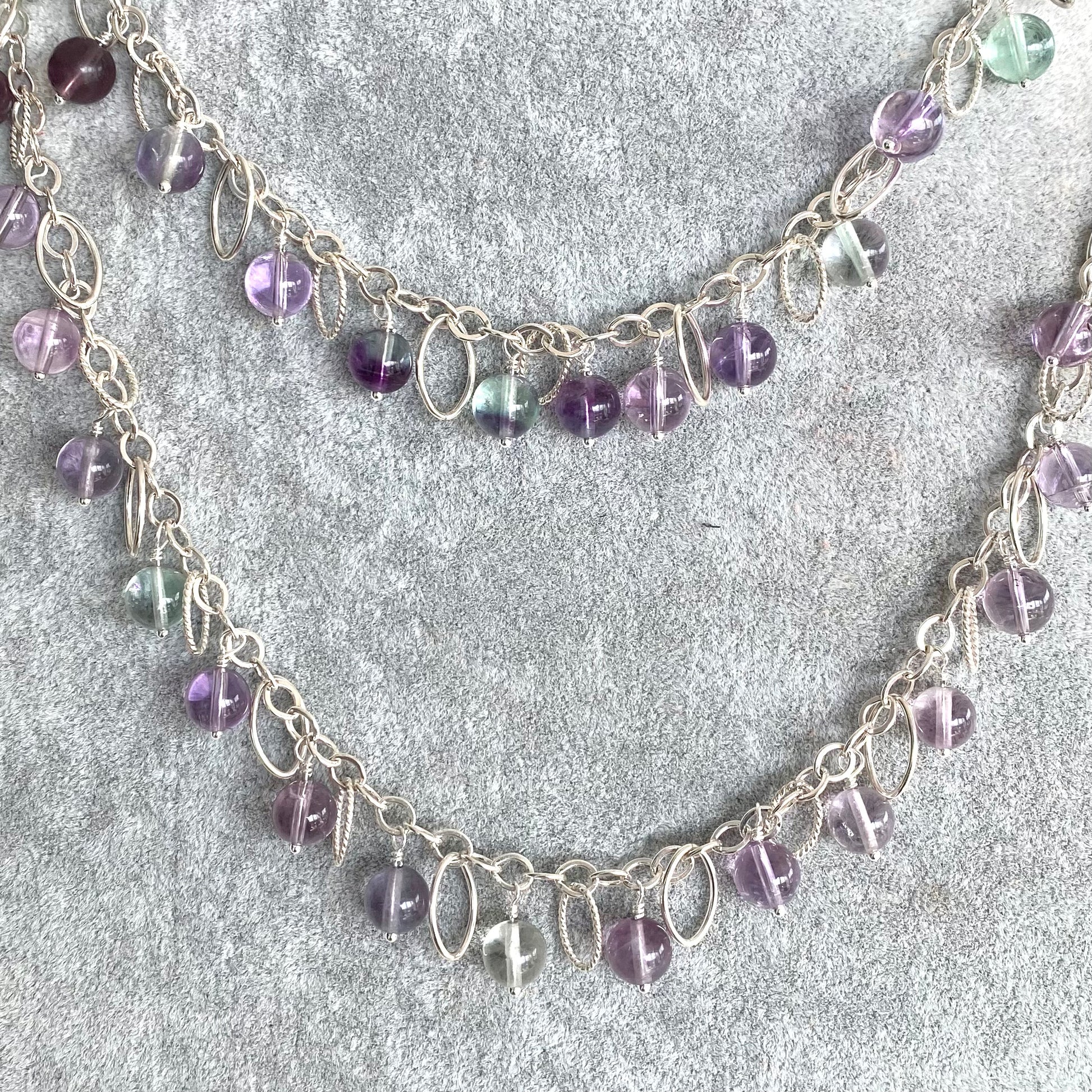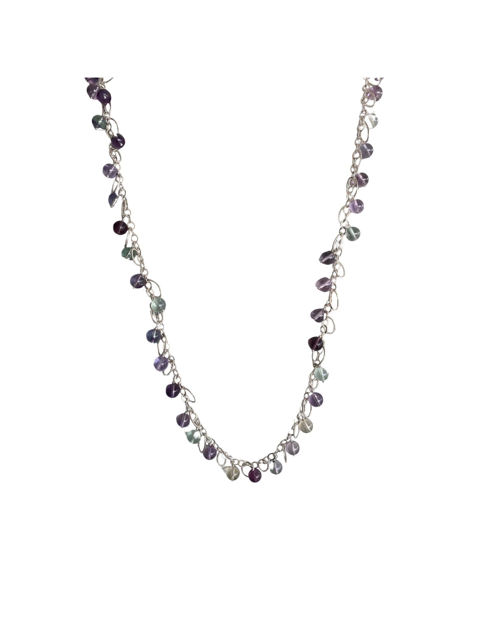 Indulge in the exquisite hues of purple and green found in the fluorite stones swaying from a sterling silver chain. This stunning necklace adds a touch of sophistication to any outfit, whether worn long or doubled up for a more dramatic effect.