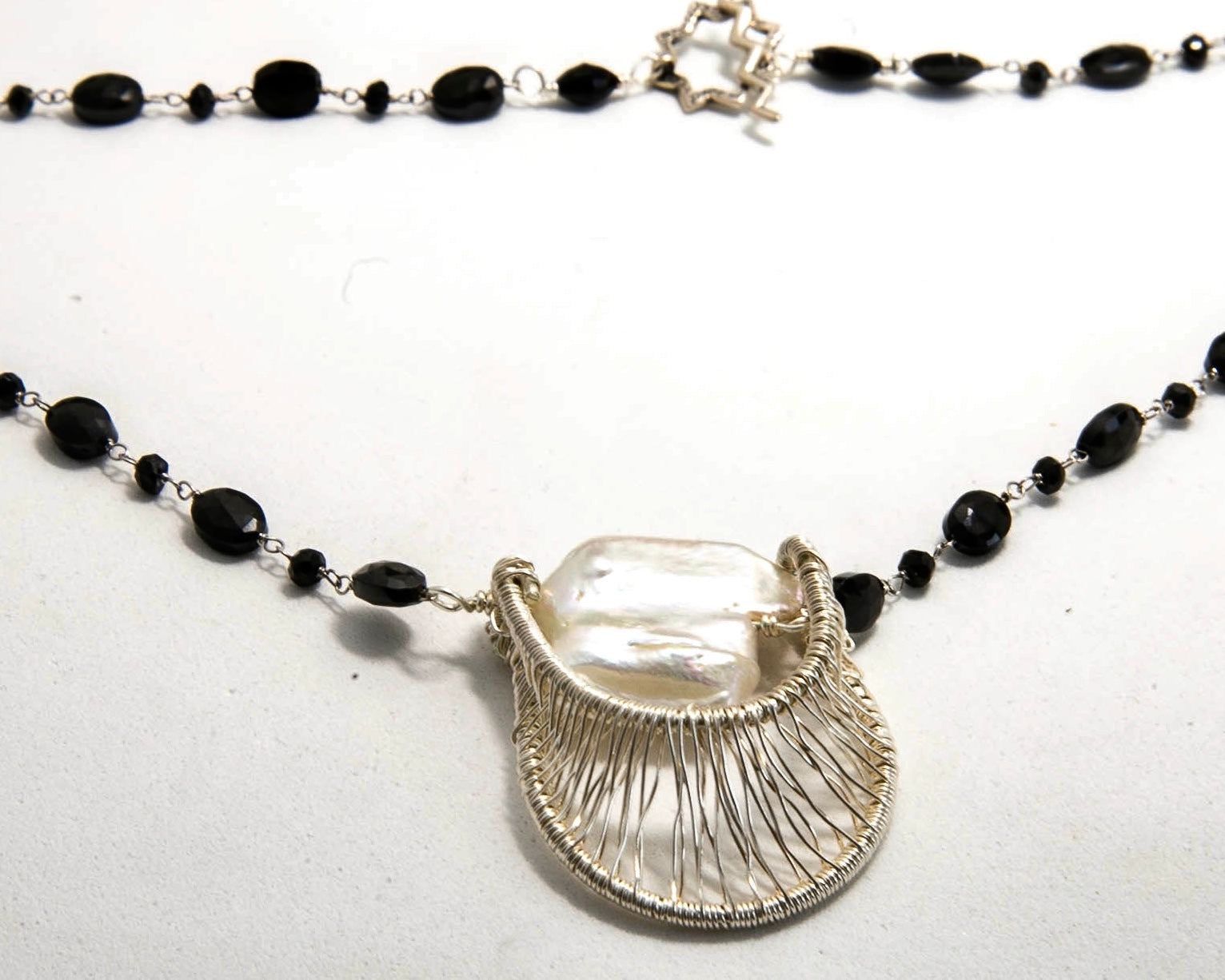 The large square Freshwater pearl framed by the handwoven fine silver basket hanging from Onyx and sterling silver chain make this piece unique and interesting.