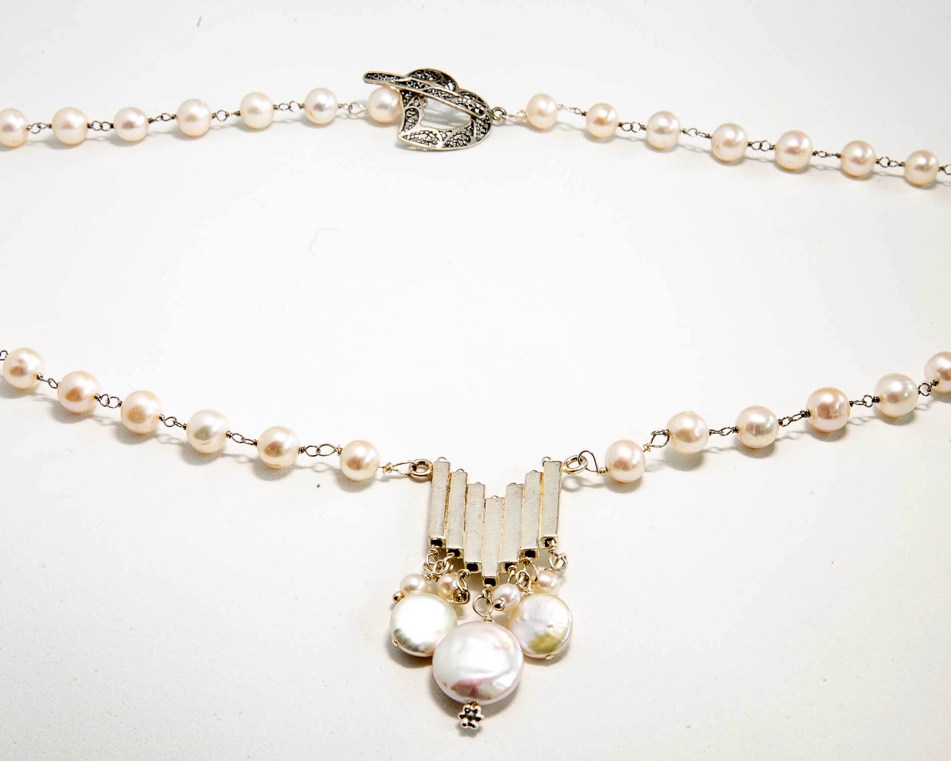 Modern girls pearls with a touch of architectural detail and a sterling silver heart clasp. This necklace is a modern classic.