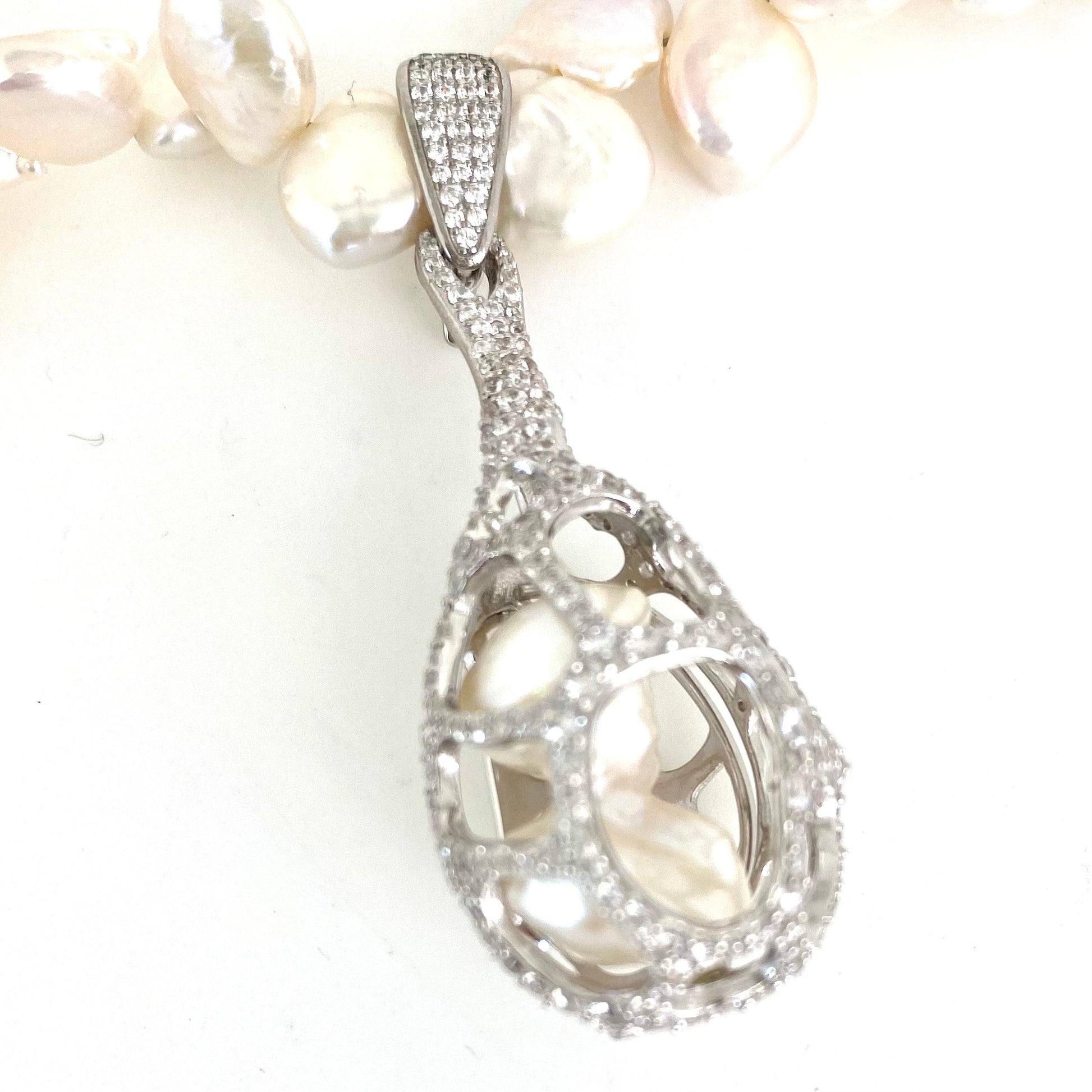 Celebrate you with this iconic freshwater pearl pendant necklace. This unique piece is a three in one. The Freshwater pearls can be worn on their own or with the pendant attached as shown. The "diamond look" pendant can be worn on its own on a silver chain, and the pearl inside can be removed for a different look. Many looks in one piece.