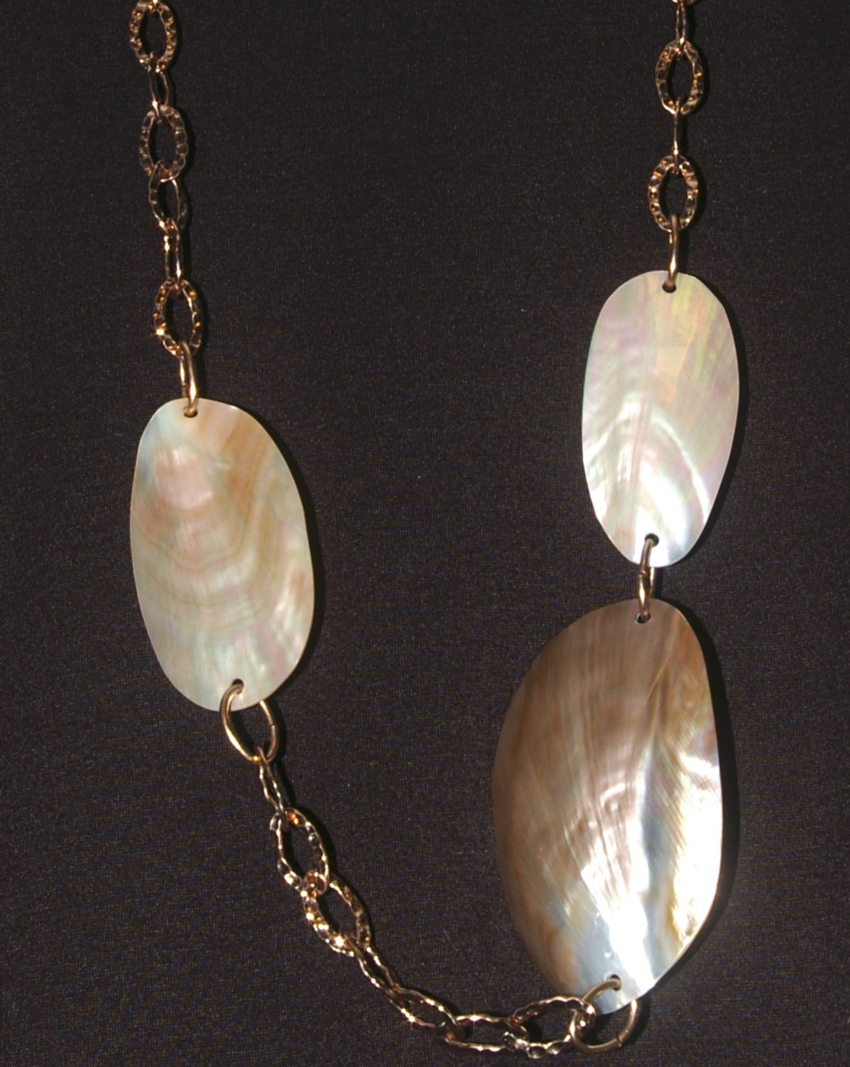The natural Mother of Pearl radiates rainbow. Wear it with blue, green, purple, pink, white or black and each time you will see different colours in this unique creation of mother nature.