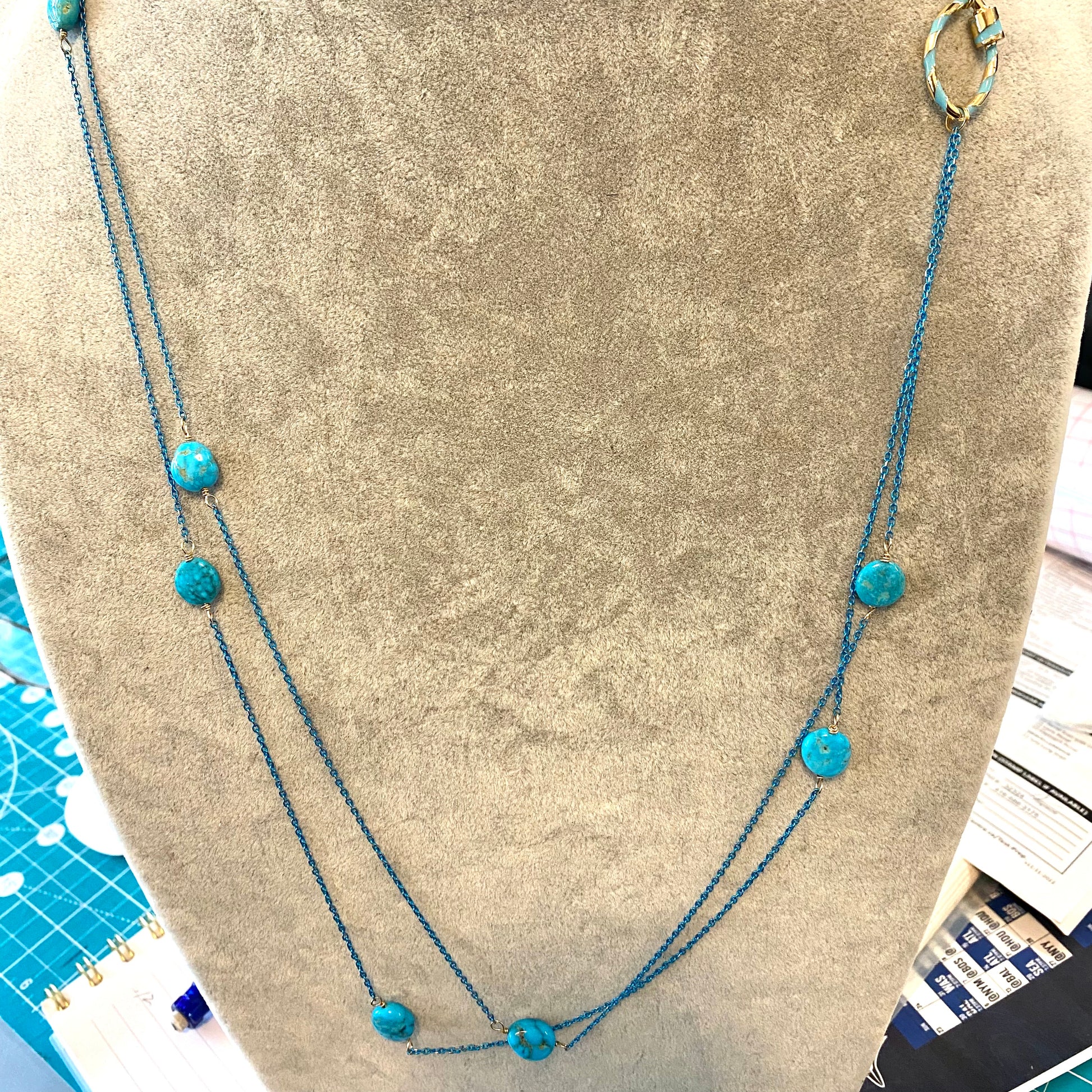 Unleash your inner risk-taker with our Playful Turquoise Necklace. This bold piece features a coated copper chain and stunning American Beauty Turquoise, with an artistic clasp that adds an adventurous touch. Make a statement and add a touch of excitement to any outfit!