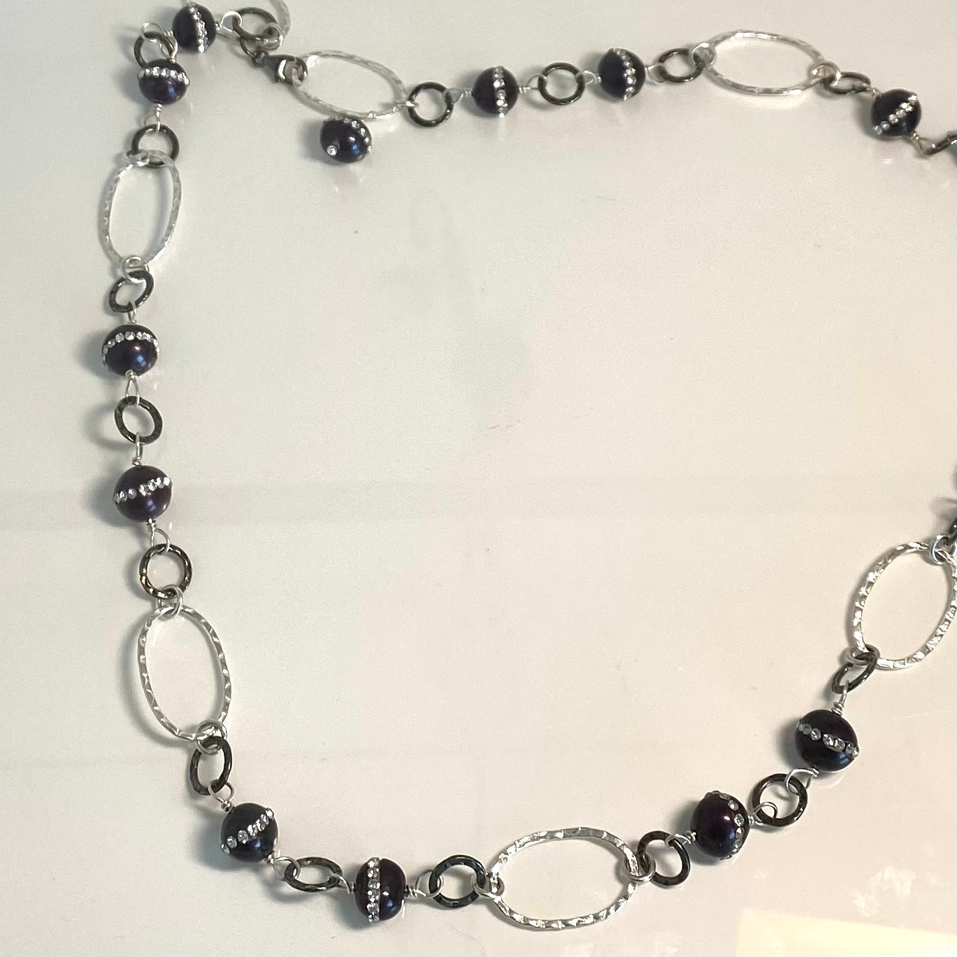 The chain is 92.5% Sterling Silver, partly oxidized to create a dramatic contrast and enhance the dark pearls.